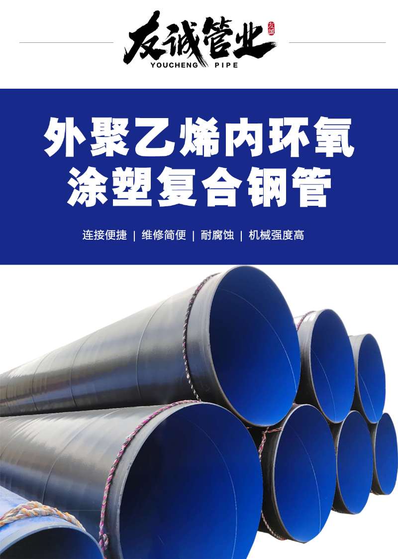 外PE內(nèi)EP涂塑鋼管的優(yōu)點:環(huán)氧粉末防腐鋼管漆膜堅韌耐水、涂膜無毒,對水無污染。附著力強,漆膜與漆膜之間都有很好的附著力。防銹耐水性能優(yōu)異,采用優(yōu)良的防銹原料,能保證其防銹性能。具有很好的機械強度、漆膜堅韌,具有耐磨和耐沖擊性能。固體含量高,涂膜較厚.環(huán)氧粉末防腐鋼管的分子結(jié)構(gòu)是以分子鏈中含有活潑的環(huán)氧基團為其特征,環(huán)氧基團可以位于分子鏈的末端、中間或成環(huán)狀結(jié)構(gòu)。由于分子結(jié)構(gòu)中含有活潑的環(huán)氧基團,使它們可與多種類型的固化劑發(fā)生交聯(lián)反應(yīng)而形成不溶、不熔的具有三向網(wǎng)狀結(jié)構(gòu)的高聚物。目前各國所采用熱固性粉末涂料主要有:環(huán)氧粉末涂料、環(huán)氧酚醛粉末涂料、聚酯粉末涂料、環(huán)氧-聚酯粉末涂料。其中,環(huán)氧粉末涂料是應(yīng)用早的品種,也是目前產(chǎn)量占據(jù)的塑料粉末涂料,廣泛應(yīng)用于靜電噴涂工藝,在裝飾性涂塑中占有很重要的位置;而環(huán)氧酚醛粉末涂料因其具有較高的耐化學(xué)腐蝕性能,所以多用于防腐蝕涂塑層。