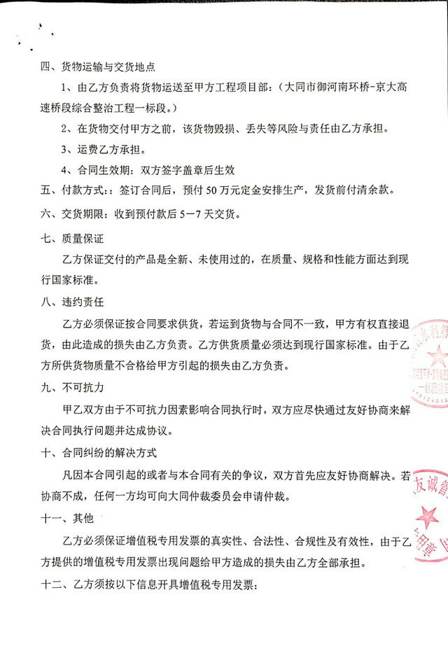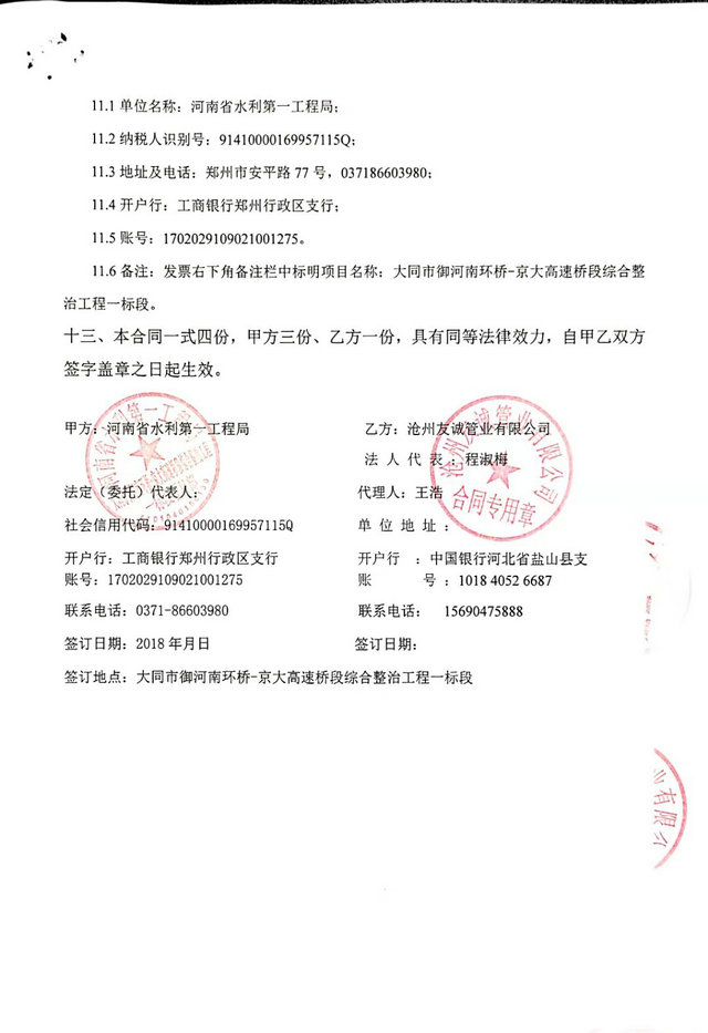 2018年我公司與河南省水利第一工程局合作,簽署大同市御河南環(huán)水利項(xiàng)目外PE內(nèi)EP防腐鋼管采購合同,此工程管道尺寸為DN1200和DN600兩個(gè)規(guī)格,其鋼管防腐采用了最新型防腐形式-外PE內(nèi)EP防腐鋼管,防腐蝕強(qiáng)度高,作為地埋鋼管耐酸耐堿強(qiáng)度強(qiáng)度強(qiáng),能夠順利合作感謝客戶對我們的信任,采購合同如下: