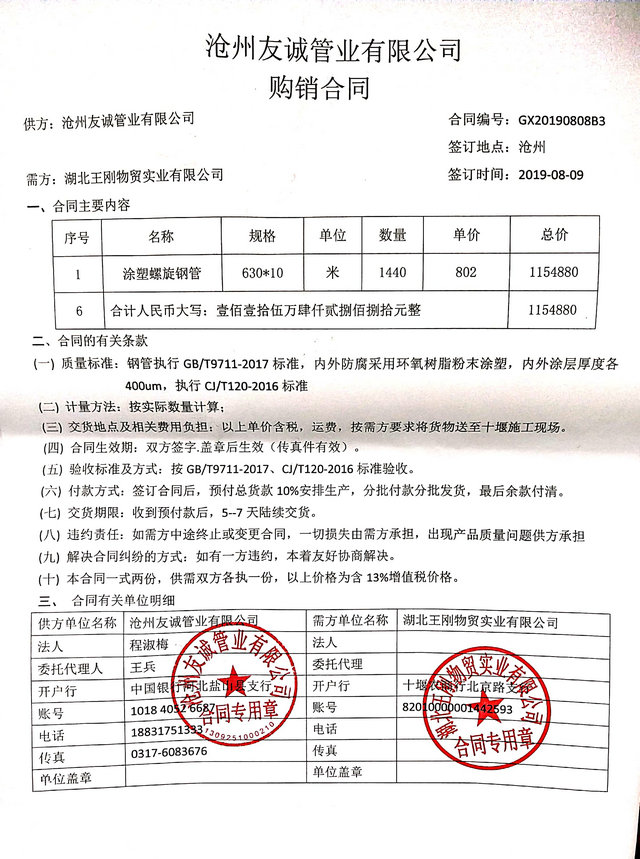 2019年8月9日我公司與湖北王剛物貿(mào)實(shí)業(yè)有限公司簽署購銷合同,市政管廊工程用DN600涂塑復(fù)合鋼管1440米,我公司專業(yè)于涂塑復(fù)合鋼管領(lǐng)域,目前國內(nèi)多地區(qū)的管廊工程建設(shè),給排水管道多用于涂塑復(fù)合鋼管,今后我們多重視于產(chǎn)品質(zhì)量,提高服務(wù)