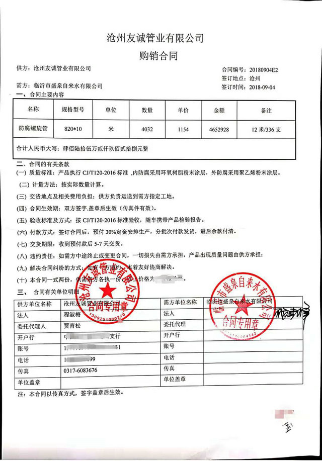 2018年9月我公司與沂州水務(wù)集團(tuán)臨沂市盛泉自來水有限公司簽訂TPEP防腐螺旋鋼管購銷合同,DN800內(nèi)外防腐鋼管4000米,感謝張總的信任,與貴公司的合同讓我們公司在自來水管道領(lǐng)域有了一個(gè)新的突破,歡迎各界領(lǐng)域客戶前來合作